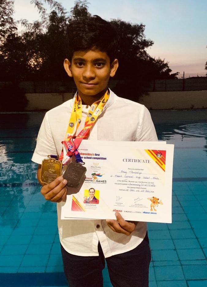 अकोला दिव्य न्यूज : जलतरण स्पर्धेतील ५० मीटर बॅकस्ट्रोक जलतरण क्रीडा प्रकारात दुसरे स्थान पटकवित रौप्य पदक आणि २०० मीटर जलतरण स्पर्धेत मध्ये प्रथम क्रमांक मिळवित अनुज आशिष पनपालिया याने एक नवीन उच्चांक गाठला आहे. माउंट कार्मेल स्कूलचा विद्यार्थी असलेल्या अनुज पनपालिया याने अकोला जिल्हा क्रीडा अधिकारी कार्यालय आणि लोकमत समुह यांच्या संयुक्त विद्यमाने ४ डिसेंबर ते ६ डिसेंबर २५ या कालावधीत आयोजित केलेल्या जलतरण क्रीडा स्पर्धेत माऊंट कार्मेल स्कुलचे प्रतिनिधित्व करीत शाळेला घवघवीत यश प्राप्त करून दिले.